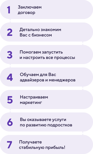 Вы получите готовую авторскую учебную методологию, маркетинговую модель, финансовую модель и другое для всех бизнес-процессов.