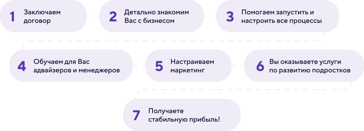 Присоединяйтесь к нам и станьте частью большого дела! Откройте высокорентабельный и социально значимый бизнес по всестороннему развитию подростков”.